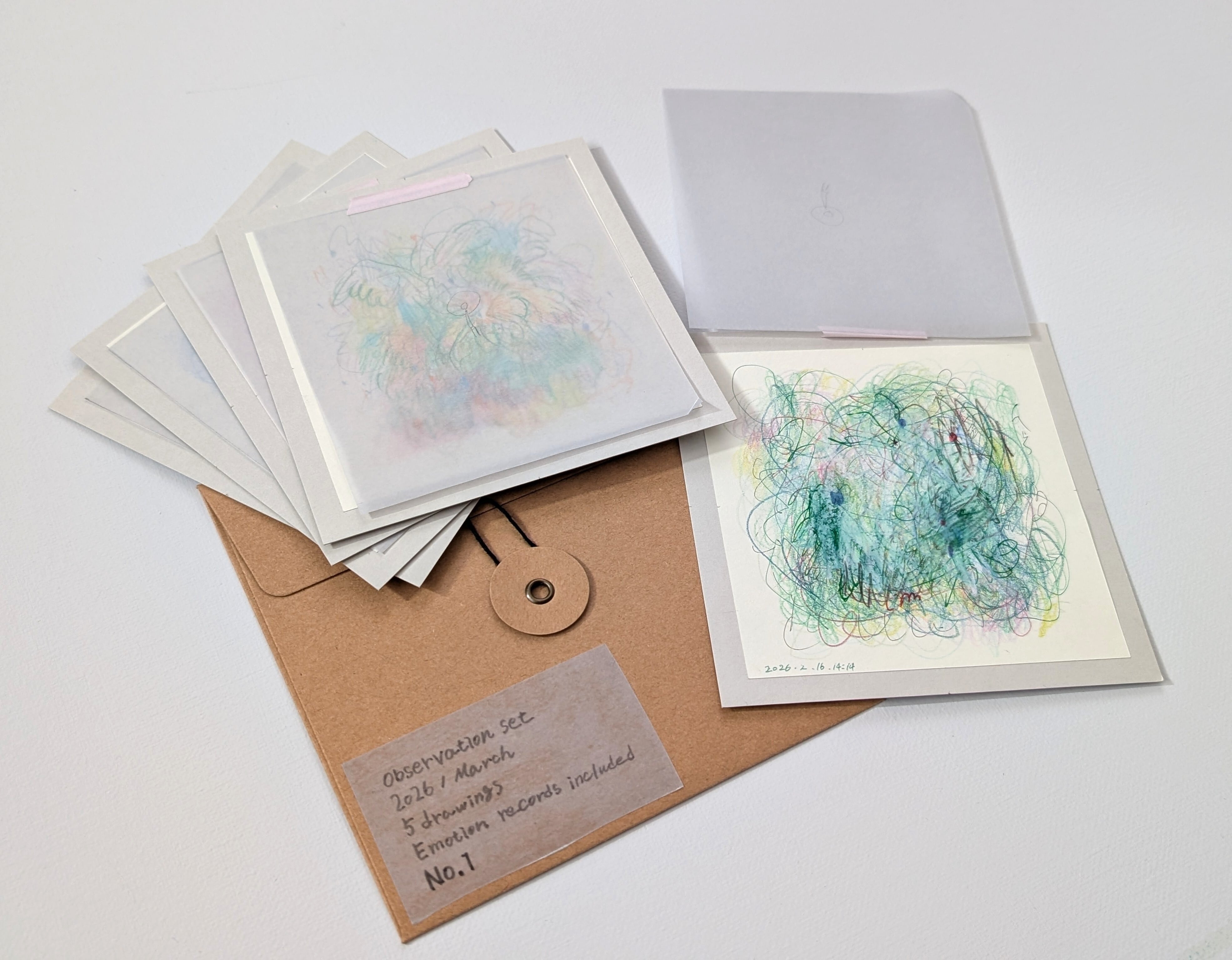 手の動きに任せた即興的な線と色、日々の身体状態や天気などの記録を収録しています。